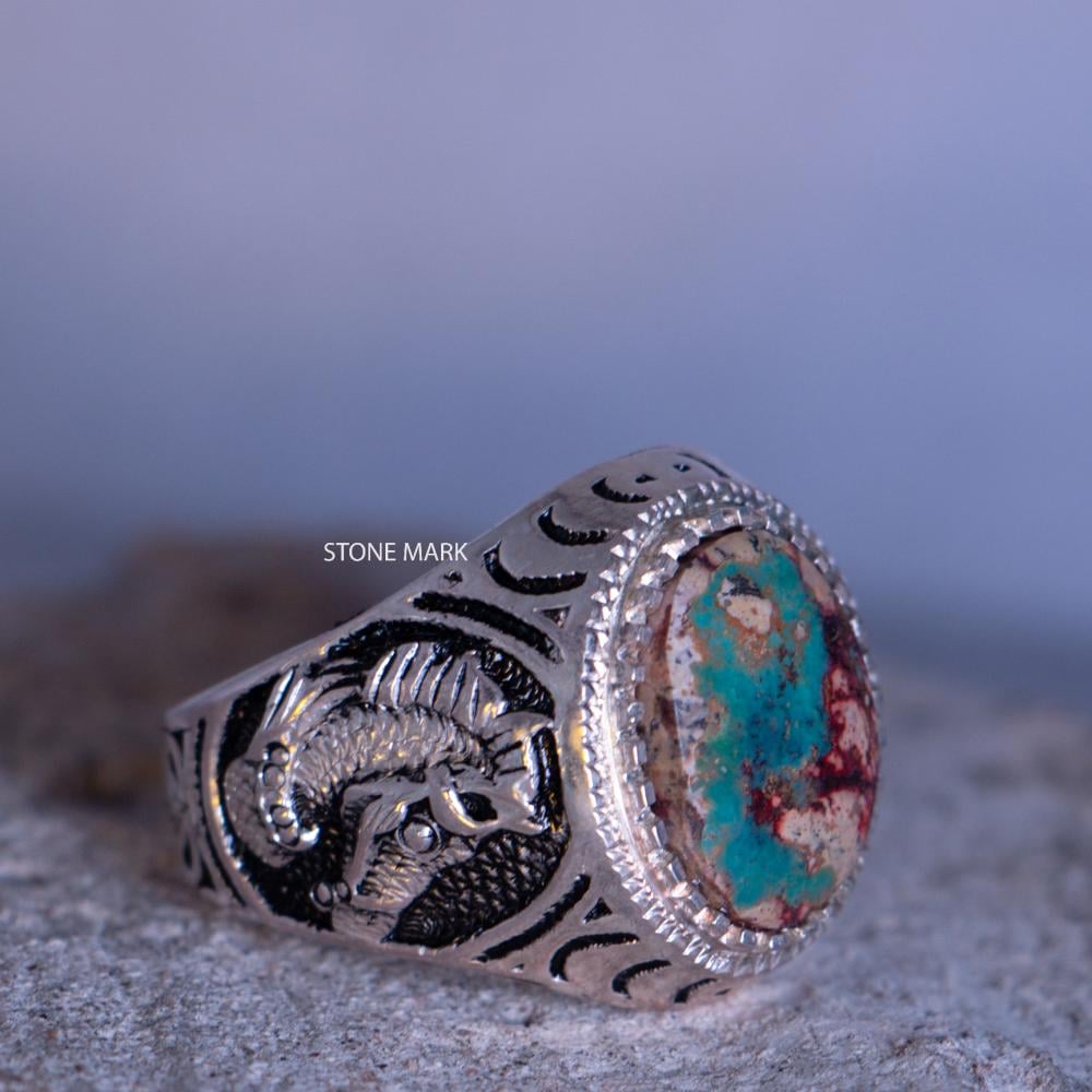 خاتم فيروز خرائطي أخضر موديل الحصان بصياغة الشريف