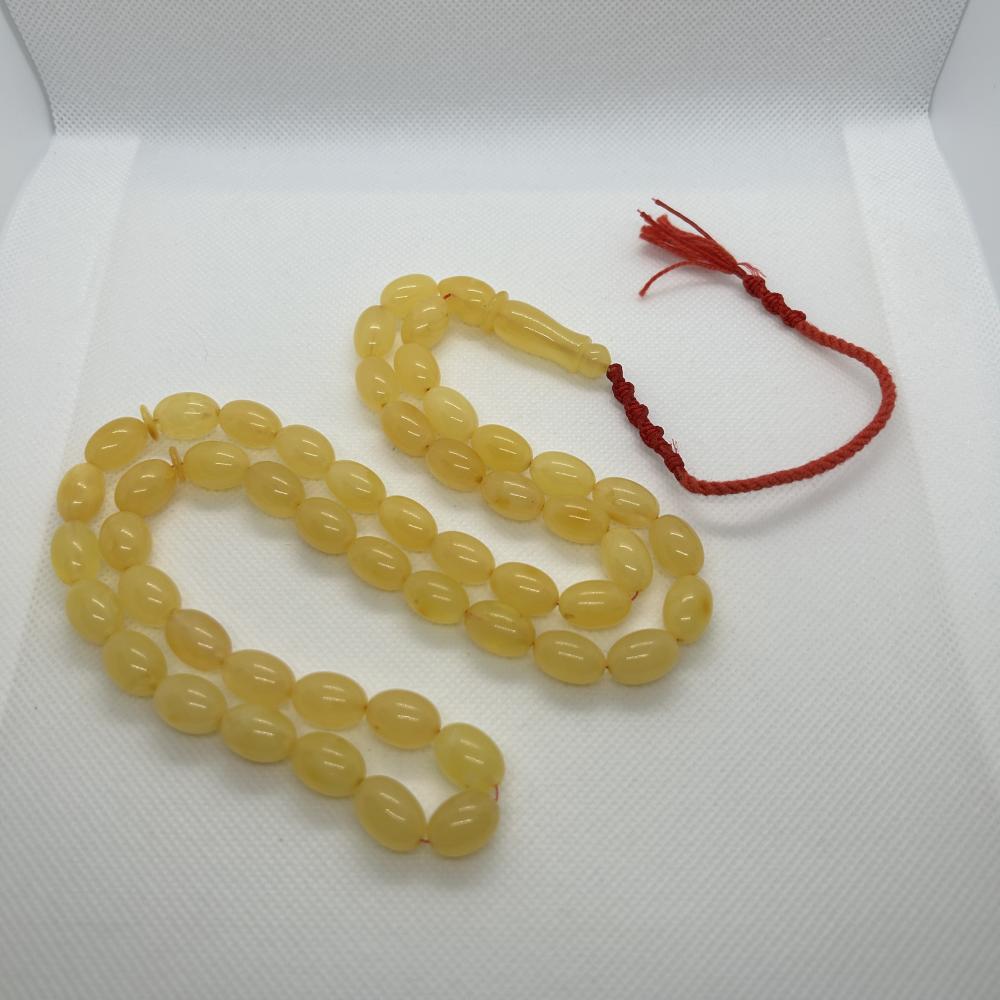 سبحة كهرمان طبيعي كالنجرادي حر الوزن: 38 جرامالقص: بيض الحمامحجم الخرز: 9 مم * 14 ممعد الخرز: 50 خرزة